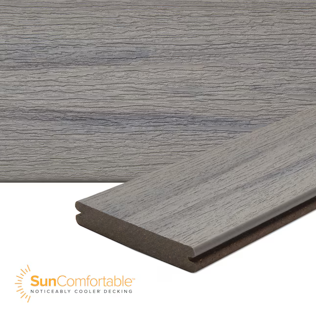 Trex Select Millstone Decking Board offers a weathered grey appearance with charcoal-shadowed undertones, capturing the timeless beauty of natural stone. Ideal for modern or coastal-inspired designs, its refined grain embossing adds visual depth. Millstone features SunComfortable technology to reduce surface heat, while its protective shell resists fading and staining. Millstone is also available in 12 ft. and 16 ft. grooved edge board, squared edge board, and as a 2 inch height edge board.